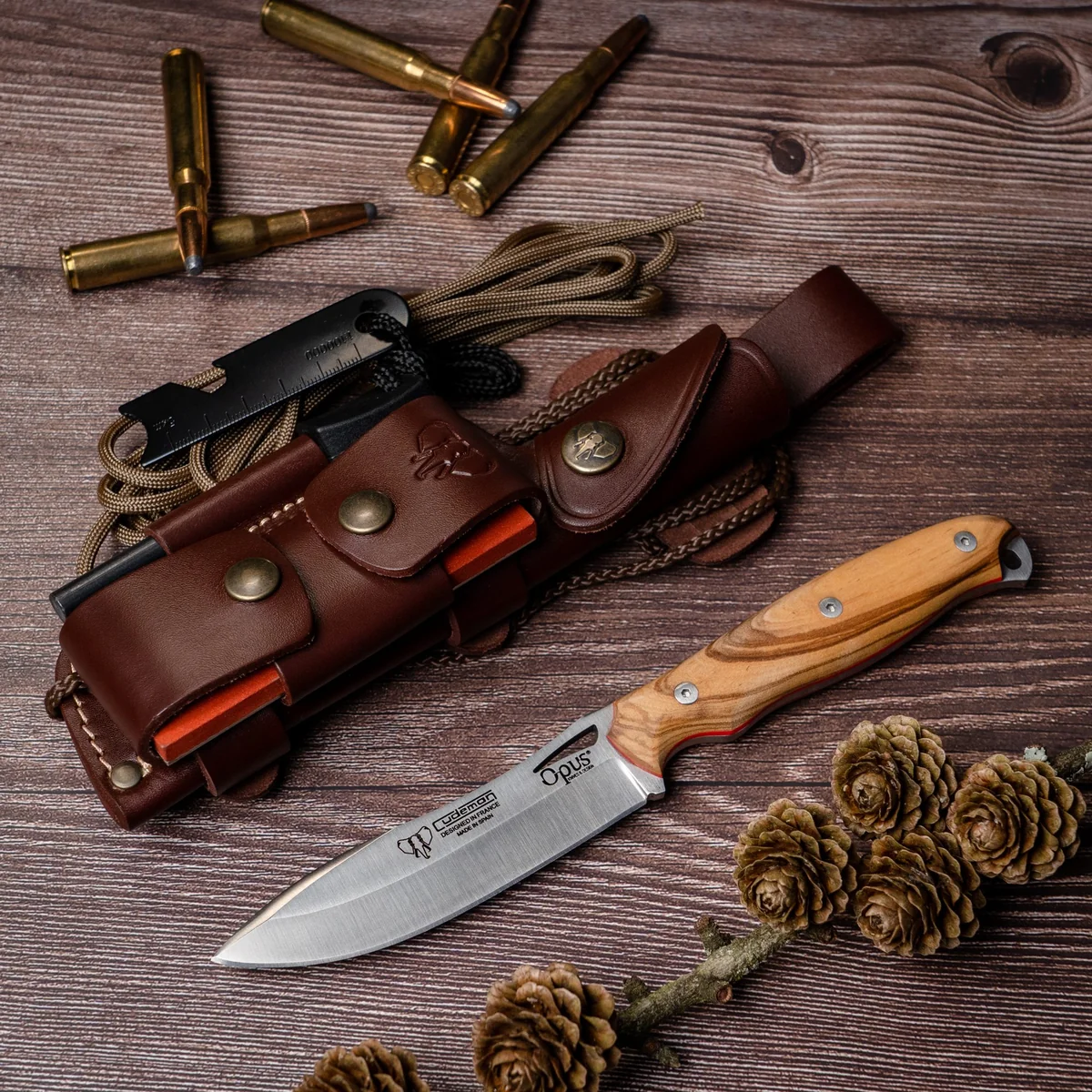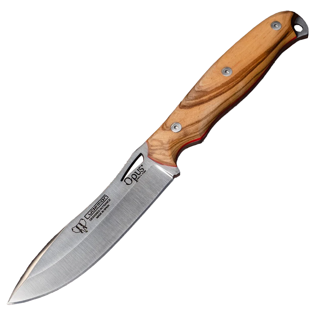 The Cudeman fixed-blade combines high-quality materials and thoughtful construction for reliable performance in outdoor and utility roles. The 10.5 cm satin-finished blade is formed on Böhler N-695 stainless steel and hardened to around 59/60 HRC, offering a sharp, durable edge with good corrosion resistance. The Nesmuk point and 4 mm blade thickness give a balance of precision and strength for a broad range of cutting tasks. Built on a full-tang foundation, the 11.5 cm natural olive wood handle is satin-finished and fitted with a red spacer for a classic, tactile grip. Hardware includes a stainless Allen screw and a brass threaded inner ferrule for secure, serviceable assembly. The knife ships with a brown leather multiposition sheath and the complete 644-C leather adapter that houses a practical survival kit: sharpening stone, signal mirror, sundial, ferrocerium striker and 2.80 m of brown paracord — making this a well-equipped companion for camping, bushcraft and general outdoor use.