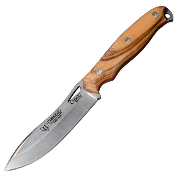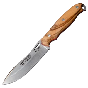- 11.5 cm satin-finished natural olive wood handle with a red spacer; full-tang construction secured by a stainless Allen screw and a brass threaded inner ferrule.