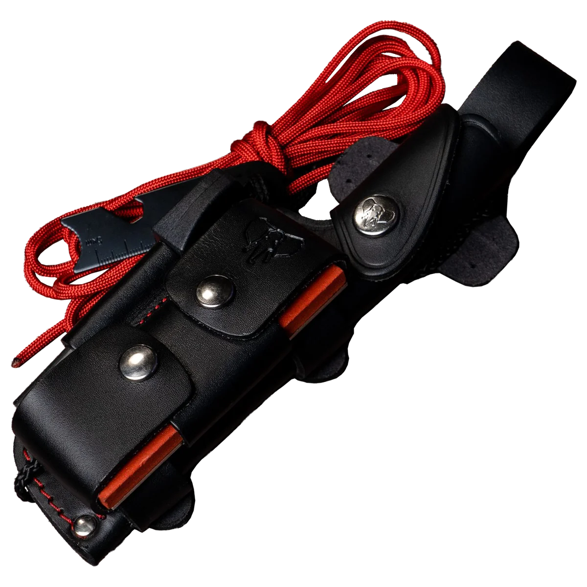 - Supplied with a black leather multiposition sheath and full leather adapter (644-N) that includes a sharpening stone, signal mirror, sundial, flint and 2.80 m red paracord; lanyard pin fitted.