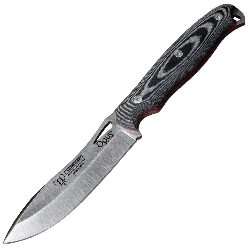 - Full-tang construction with black satin Micarta handle and red spacer; 11.5cm handle secured by stainless Allen screw and brass threaded internal bushing.