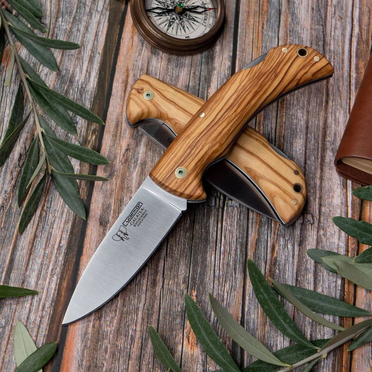 - 11.5 cm natural satin olive wood handle with brass anchoring and lanyard pin for a secure, comfortable grip and precise control.