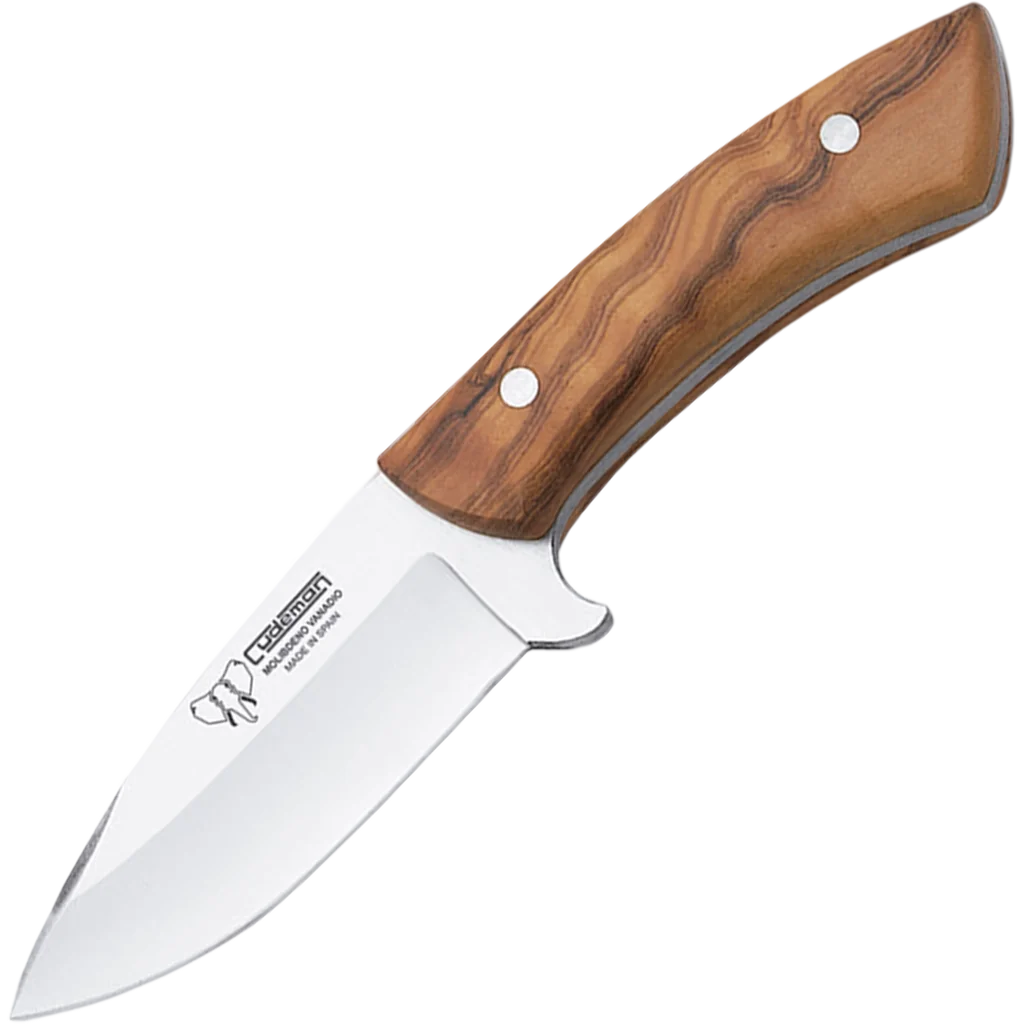 The Cudeman Colibrí I is a classic fixed-blade knife valued for its lightweight, straightforward design and practical reliability. A distinctive fin-shaped guard on the blade provides a positive stop to help prevent the hand from sliding forward during use. The blade’s hollow grind and satin finish deliver clean, controlled cuts while the drop-point tip offers versatility for a wide range of cutting tasks. Built with a full-tang construction in molybdenum‑vanadium steel hardened to 54–56 HRC, the Colibrí I balances strength with ease of maintenance. The 11 cm oil-treated satin olive wood handle is comfortable in the hand and secured with a flat aluminium rivet. Supplied with a premium brown leather sheath made in Spain, the knife measures 21 cm overall and weighs approximately 200 g — a compact, well-finished tool for outdoor and general utility use.