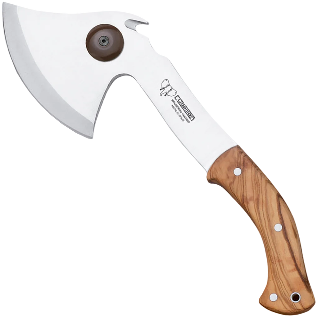 The Cudeman full-tang hatchet combines traditional design with modern materials for dependable outdoor performance. The 21 cm satin-finish head is blade-weighted for improved chopping power and features a hatchet-style tip and a ground edge for clean cuts and controlled shaping. At 4.8 mm thickness and a 10.5 cm face width, the blade balances bite and durability for tasks around camp and during woodcraft. Built for durability and comfortable use, the axe has a 13.5 cm natural olive-wood handle finished to a satin sheen and anchored with a flat aluminium rivet. A lanyard pin provides an option for attaching a retention cord. A brown leather sheath is included for safe storage and transport, making this a practical, ready-to-use tool for outdoor and general utility jobs.