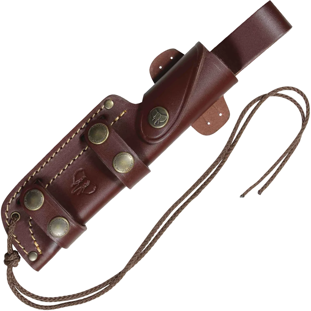 - Supplied with a brown leather multi-position sheath (approx. 110 g) and a stud for a retention/lanyard cord.