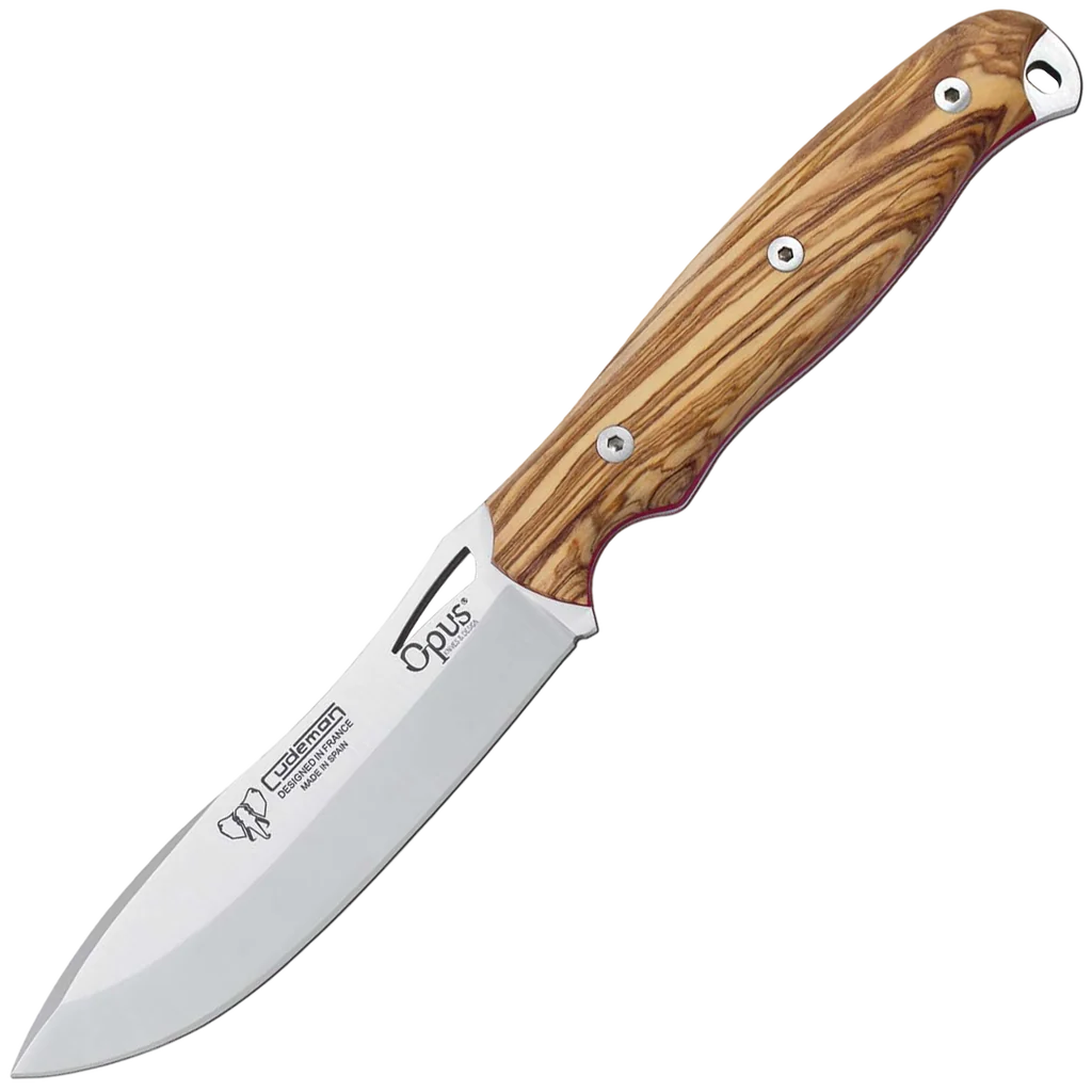 - Full-tang construction with satin-finish natural olive wood handle, red spacer and stainless Allen screw with internal brass threaded bushing.