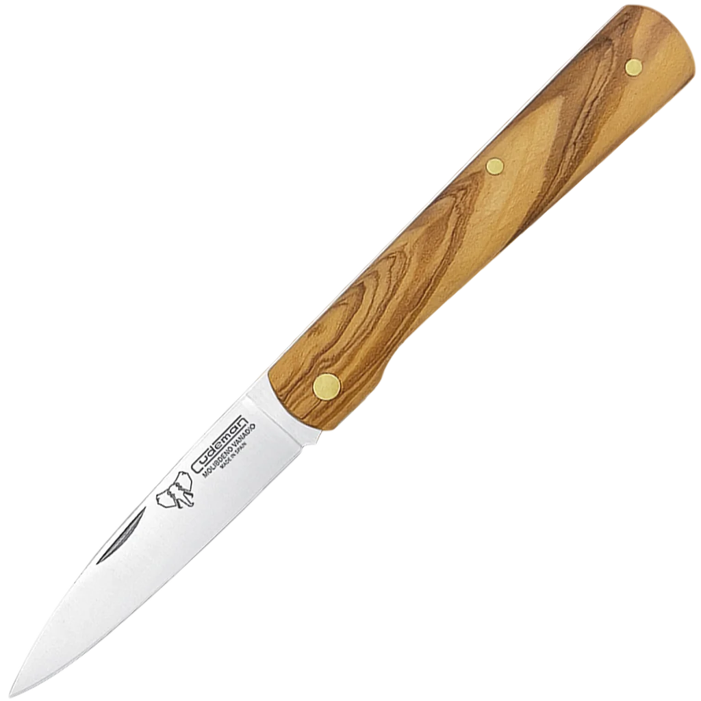 The Cudeman folding knife pairs compact dimensions with considered materials for everyday use. Its 7 cm (2.8") satin-finished blade features a broad stiletto point and a 2.5 mm thickness, offering a precise cutting profile for detailed tasks. The knife weighs approximately 50 g and folds to a small, pocket-friendly size while presenting a balanced 16 cm overall when open. Blade performance comes from molybdenum–vanadium steel tempered to 54–56 HRC, providing dependable edge-holding with straightforward maintenance. The handle is crafted from satin-finished natural olivewood with brass fittings for a classic look and a comfortable grip. A piston locking mechanism secures the blade in use. A matching brown leather sheath (Ref. 635-C) is available separately for protected carry and storage.