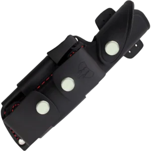 - Black satin Micarta handle with red spacer on a full‑tang build; stainless Allen screw and brass threaded inner ferrule, thumb notch, lanyard pin and an integrated striker/pusher plus Micarta front inlay to assist batoning.