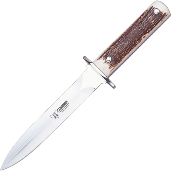 This is a top quality dagger made by Cudeman. It has a 6.5" razor sharp, double edged blade with a satin finish – constructed from MOVA stainless steel. A deer stag handle completes the knife and is accompanied by a 420 polished stainless steel finger guard and flat head rivets.