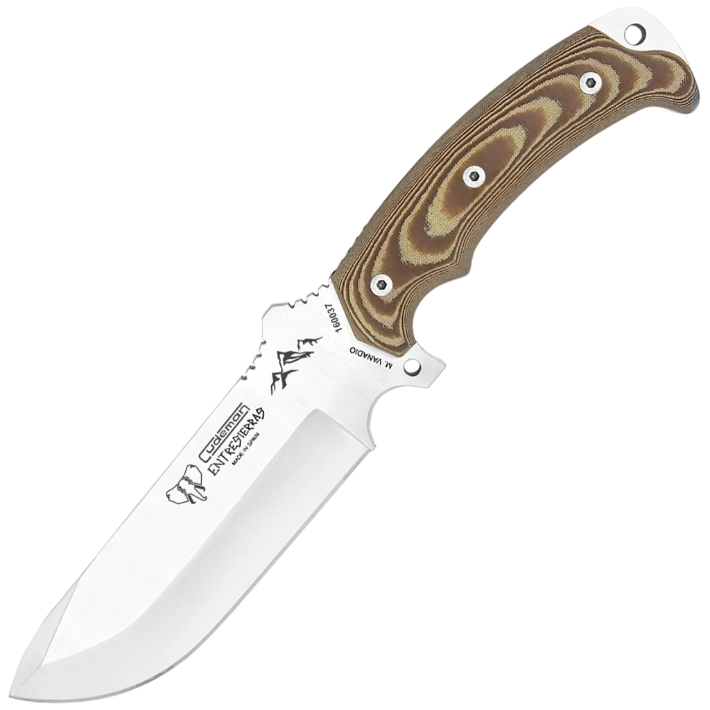 - Brown satin Micarta handle, 13 cm long, with black spacer, double textured grooves for improved grip, thumb choil, pommel striker and lanyard hole; secured with a stainless Allen screw and brass threaded ferrule.