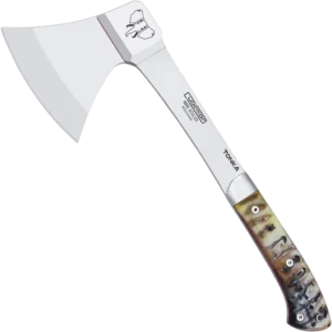 This Cudeman axe combines a substantial Böhler N-695 cutting head with a compact, user-friendly profile. The 21 cm (8.3") satin-finished blade is 5 mm thick and set with a blade-weighted design to deliver solid chopping performance while keeping the overall tool manageable at 36 cm long. Heat-treated to 59/60 HRC, the head offers good edge retention and wear resistance for repeated use in outdoor and workshop tasks. The one-piece (enterizo) construction secures a polished ram-horn handle with a red spacer for a distinctive look and reliable grip. Assembly uses a satin A-304 stainless ferrule, a brass-threaded interior sleeve and a stainless allen screw to ensure the handle stays firmly anchored. A brown leather sheath is included for protection and transport, making this axe a practical choice for campsite chores, woodcraft and general outdoor work where a compact, durable tool is required.
