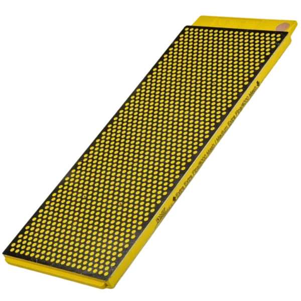 The Medium Extra-Fine (4000 mesh, 6 micron) and the Extra Extra-Fine (8000 mesh, 3 micron) are the finest grits that DMT offers. These grits are used only in creating that perfect razor sharp edge after you've worked your edge to near perfection on an extra fine stone. The 10" DuoSharp Plus Bench Stones are designed with DMT's signature polka-dot (aka interrupted) pattern on steel plates attached to a central core. The large 10" stone can handle knives, scissors, and tools of any size.The overall size of the DMT 10" DuoSharp is very generous at 10" long and 4" wide. The 40 square inches of diamond sharpening surface is enough to ensure long strokes of your tool or knife, and more than enough space for even large plane blades. The double-sided stone offers a more economical way to own both grits on such a large stone.