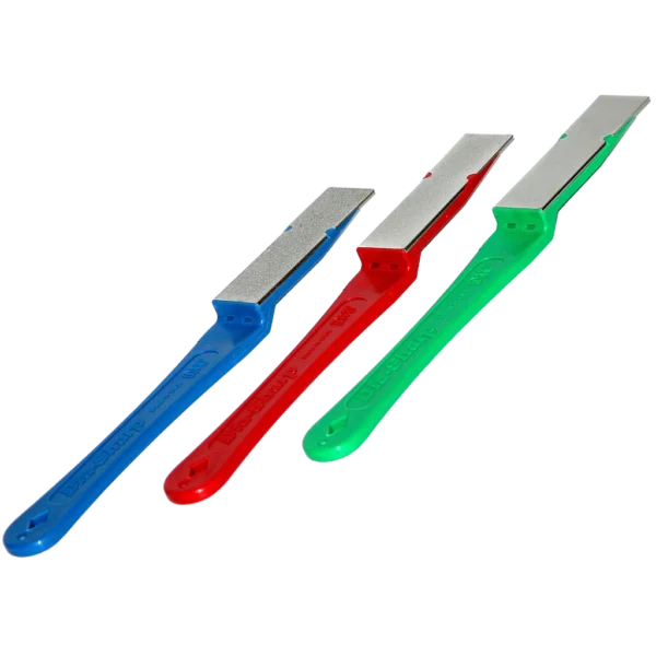 DMT Dia Sharp Off Set Mini Hone Kit. Includes Coarse, Fine, and Extra Fine Stones. Each sharpening area measures 2 1/2 x 3/4". Blue, red and green ergonomic handles. Excellent for small and pointed tools. Allows for comfortable sharpening, deburring and honing in tight spaces. Stays flat. Hang packaged.