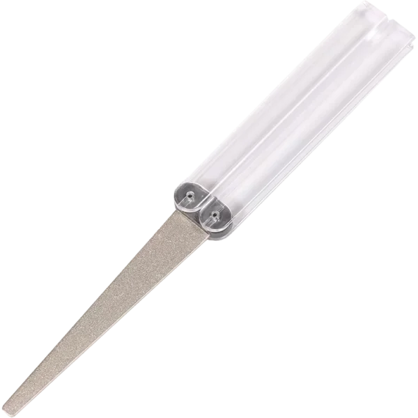 Diafold sharpeners feature a carrying case that unfolds into a permanently attached handle. When folded, this carrying case protects the tool's surface. When unfolded, the handle facilitates ease of use. It reaches virtually anywhere where there is an edge to be honed. 9.5" When opened. 5" Closed. Extra Coarse. 220 grit.