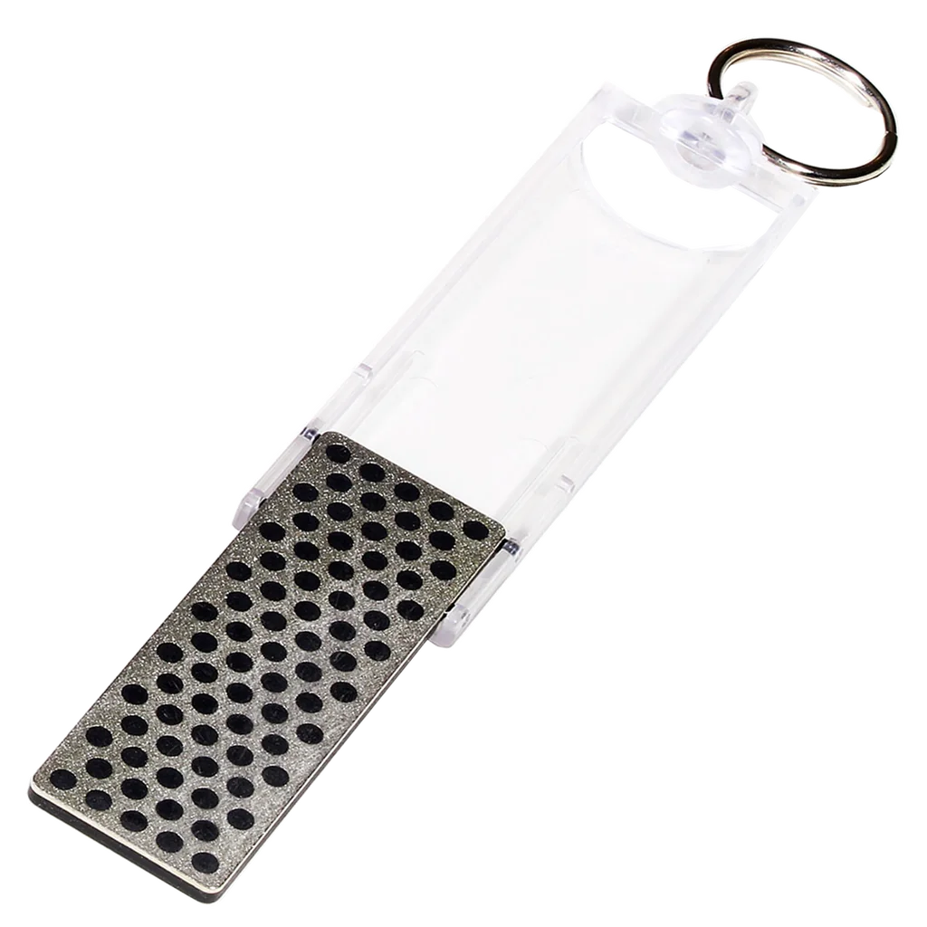 Diamond Mini-Sharp® Sharpener – a Diamond Whetstone™ that travels with you. Folding handle protects the stone when not in use. Lightweight and ultra portable, handy key chain swivel ring for your keys or attach to zipper pulls or backpacks. Extra-Coarse diamond (60 micron / 220 mesh) when significant removal of material is needed for a damaged edge. Handy Size: 5 1/2" opened. Size: 2 11/16" x 15/16" x 3/16". Sharpening with diamonds is fast and easy. No messy oils needed—sharpen dry or with water. Durable construction will provide years of consistent performance and reliable service For proper tool maintenance, woodworkers, chefs and other professionals rely on the superior quality and versatility of DMT® products. Made in USA.