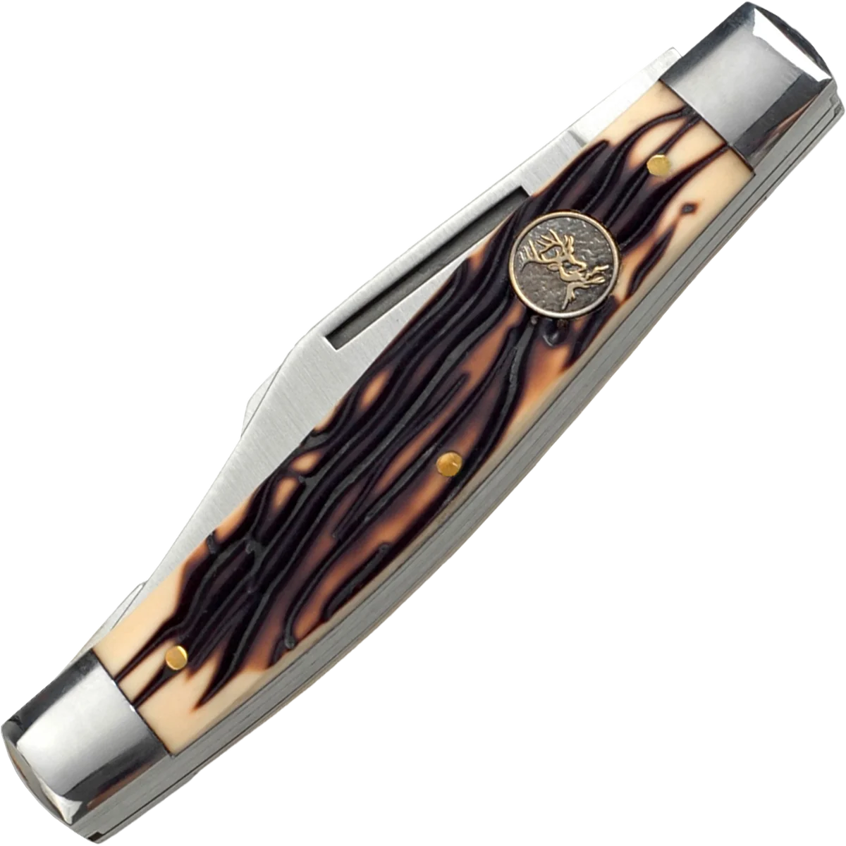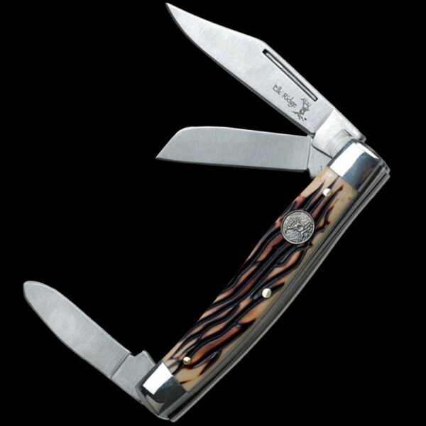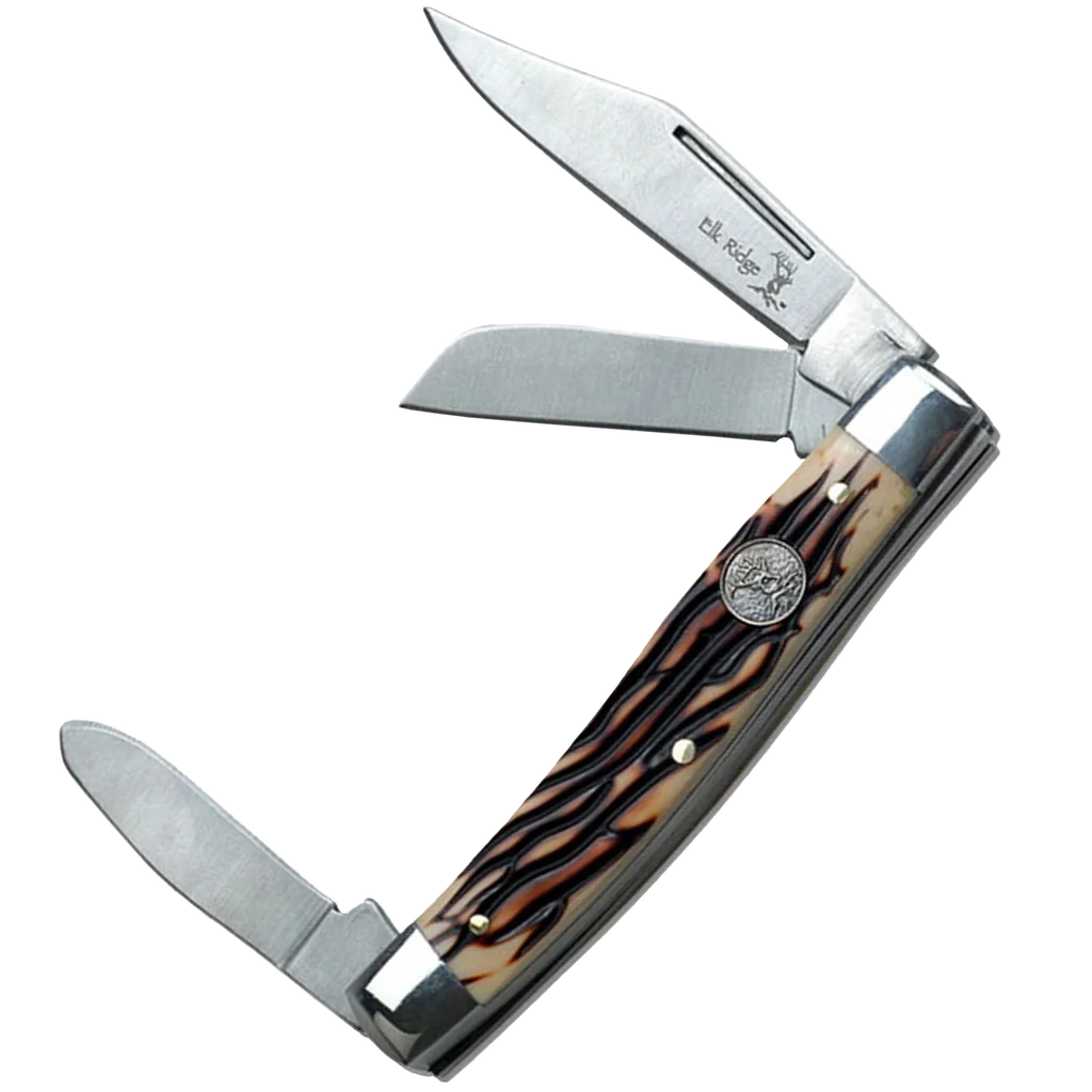 The Elk Ridge ER-323ISS Stockman features satin finish stainless steel blades and a simulated bone handle. It has three blades, one larger clip point, and a smaller sheepsfoot and spey blade. Each blade opens with a nail nick and utilises a slip joint mechanism.
