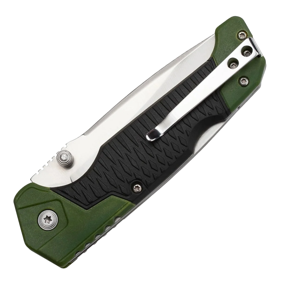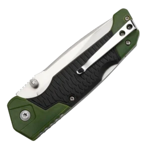 The Elk Ridge Alpine Folder features a 3.5" 8Cr13MoV stainless steel drop point blade with a satin finish. It’s a manual flipper with ambidextrous thumb studs. This lockback has alpine green injection-molded nylon fiber handles with black rubber overmold and a tip-up pocket clip. It’s 4.5" closed and weighs 4.41 oz.