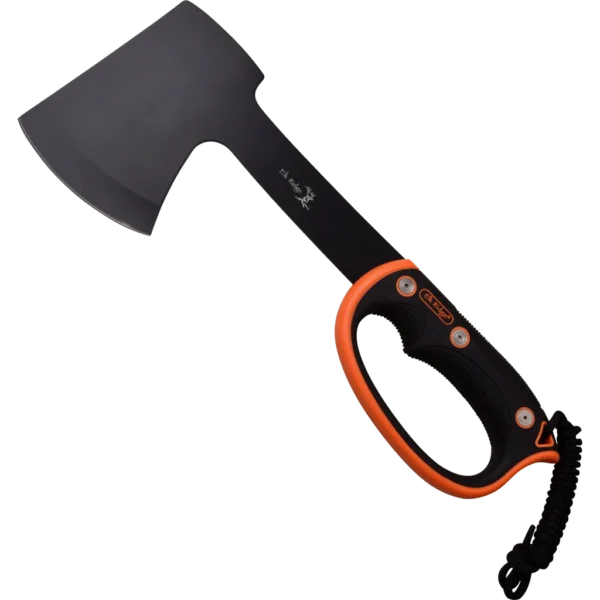 - Heavy duty axe constructed from 440 stainless steel with a black coated finish. Orange ABS and black rubber handle with D-gaurd handle for increased grip, also includes a 550 paracord lanyard and nylon sheath for safe transportation.