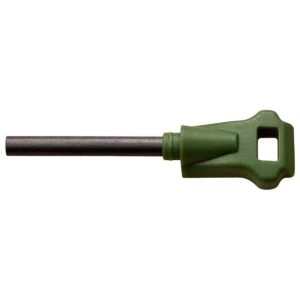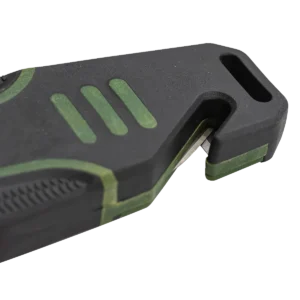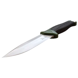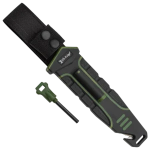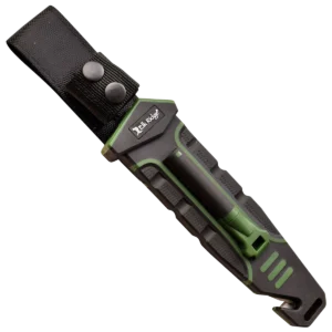 Model – ERAPFIX001CS. Frontier Fixed Blade Green. 11 inch (27.94cm) overall. 5.5 inch (13.97cm) satin finish 8Cr13MoV stainless blade. Green nylon handle with black rubber overmold. Full tang. Lanyard hole. Sheath features a fire starter and sharpener. Black nylon belt sheath.