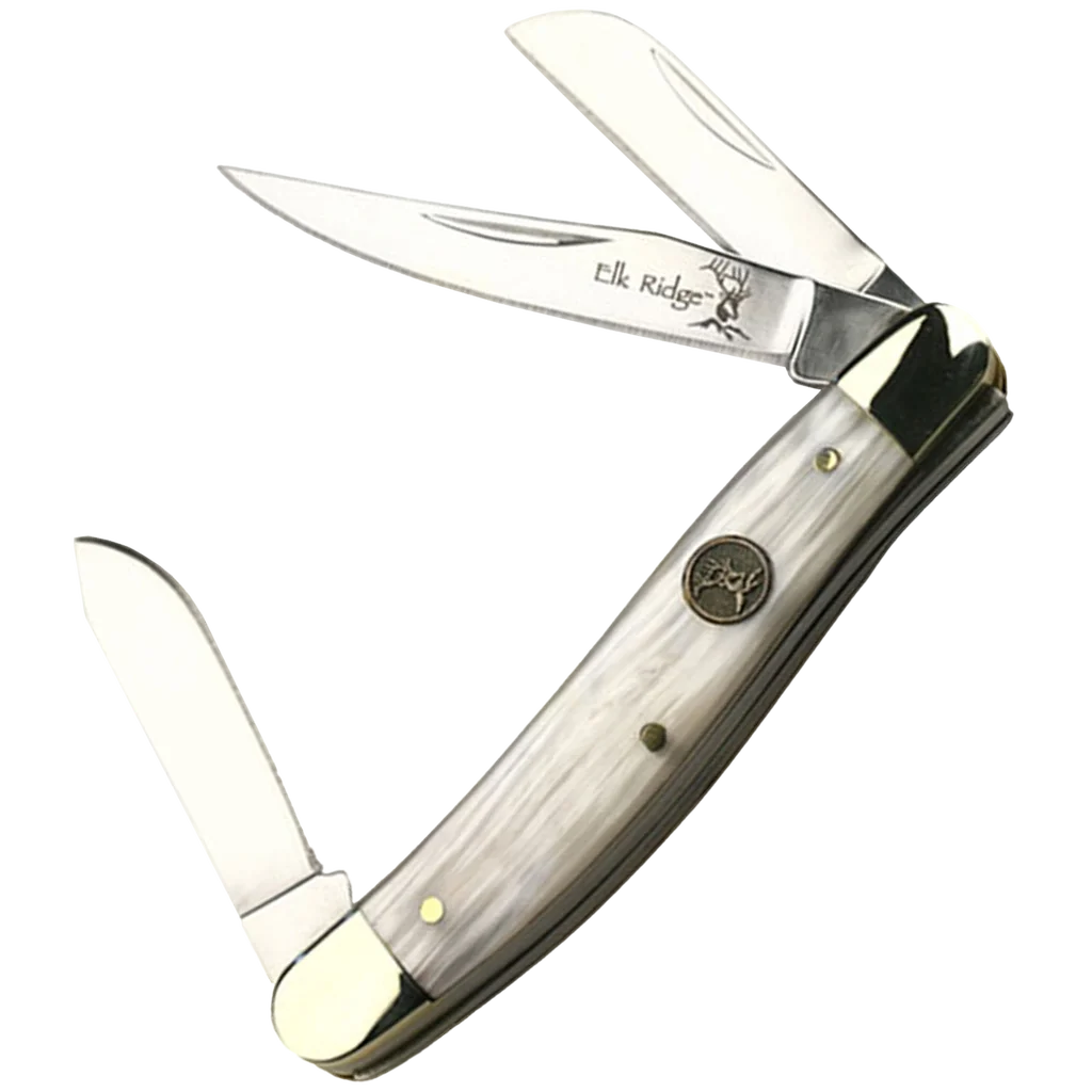 The Elk Ridge ER-323WP Stockman features three satin finish stainless steel blades and a gorgeous Faux Mother of Pearl handle, with nickel silver bolsters and inlaid Elk medallion. The three blades are; one larger clip point, and a smaller sheepsfoot and spey blade. Each blade opens with a nail nick and utilises a slip joint mechanism. The range of blades allows for a greater number of cutting applications in one small package. Perfect for taking to the campsite or for survival training and bushcraft uses.