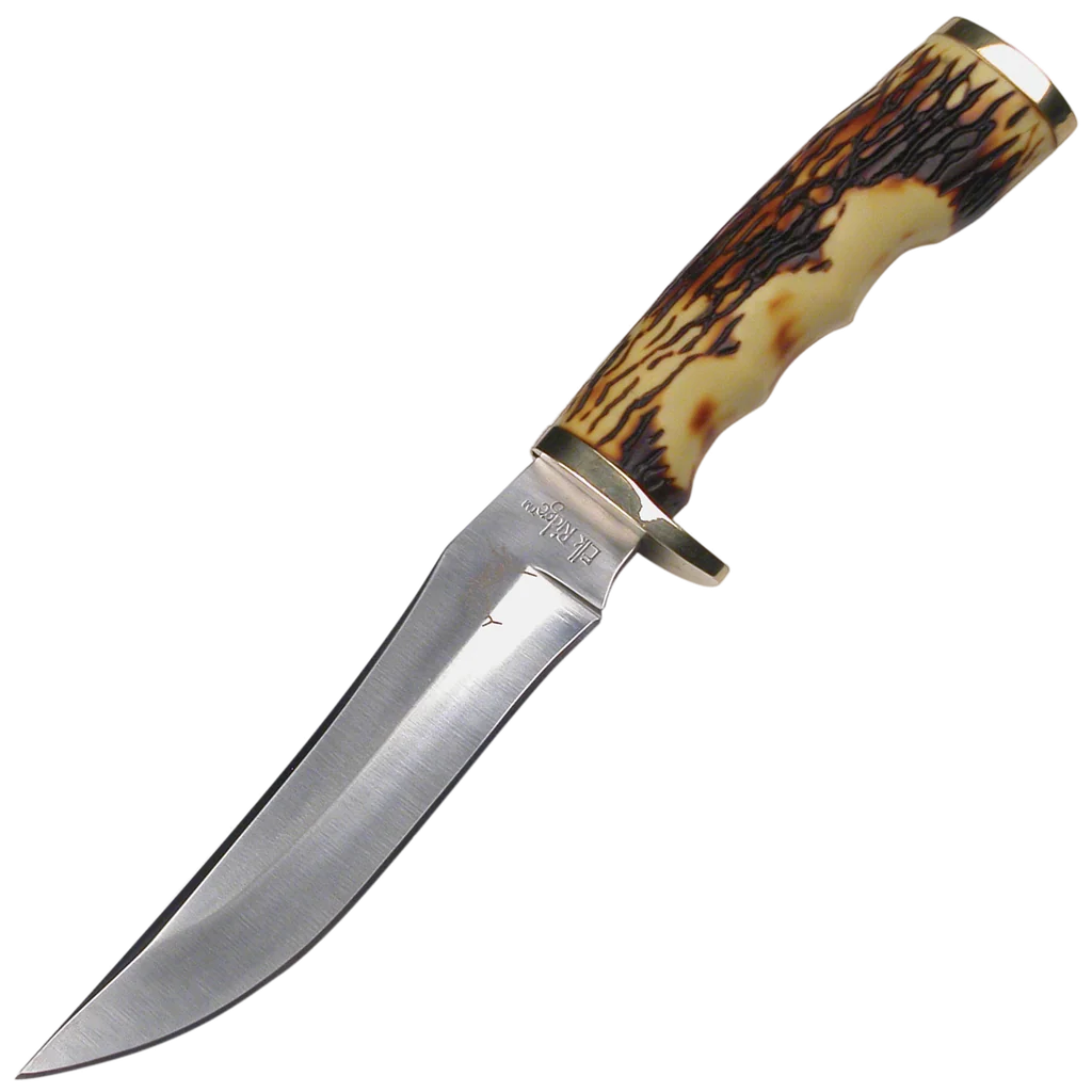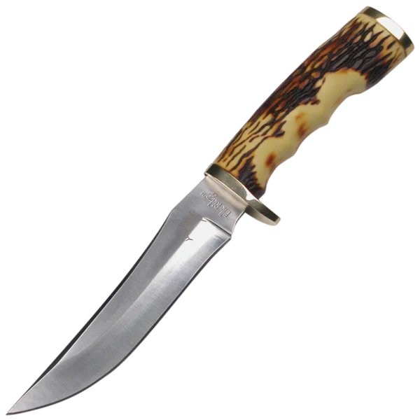 The ER-027 Fixed Blade Knife measures 8" overall. The 440 high carbon surgical steel blade measures 4.5". There is a finger grooved imitation stag handle with brass guard and pommel for easy grip. Also includes an embossed black leather belt sheath for easy carry.