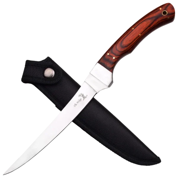 Ideal for fishermen looking to up their filleting game. This knife features a long slender blade designed to make light work preparing your fish! It has an attractive approx 7" long mirror finished blade with high/full flat grind. The handle is made from dark brown pakkawood that prevents slipping even when dealing with wet and slippy conditions. The knife comes with a black nylon fibre sheath to safely store the blade when not in use.