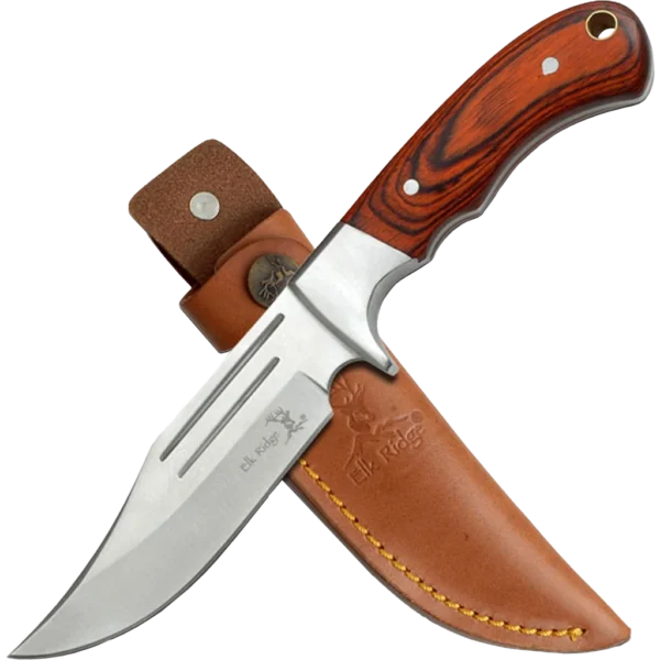 The Elk Ridge ER-052 is a knife made for the outdoorsman! The addition of the forward finger groove allows for more precision when handling, making it an ideal knife for bushcraft and survival tasks. The 5" full tang bowie blade of the ER-052 is constructed from 3Cr13 and offers the perfect balance between hardness and corrosion resistance. The knife is finished off with a dark brown wood handle and lanyard hole plus leather sheath for safe, easy carry.