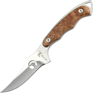 The Elk Ridge Model ER-059 Fixed Blade Knife is a great companion to take on your next hunting trip. It features a 440 stainless steel Trailing point blade and a maple burlwood handle. The knife comes with a tan leather sheath with a belt loop for easy carry.