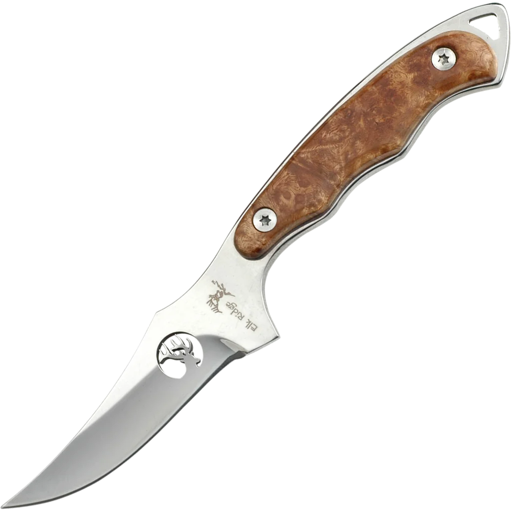 - Fixed blade made from 440 Stainless Steel with a Trailing Point profile, elegant Maple Burl wood handles and elk laser cut out . Also includes a genuine leather sheath for transpotation.