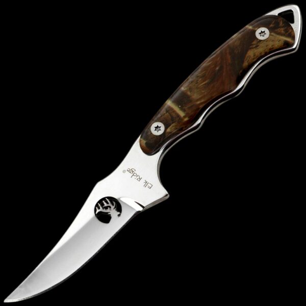 - Fixed blade made from 440 Stainless Steel with a drop Point profile, Pakkawood handles and elk laser cut out . Also includes a genuine leather sheath for transpotation.