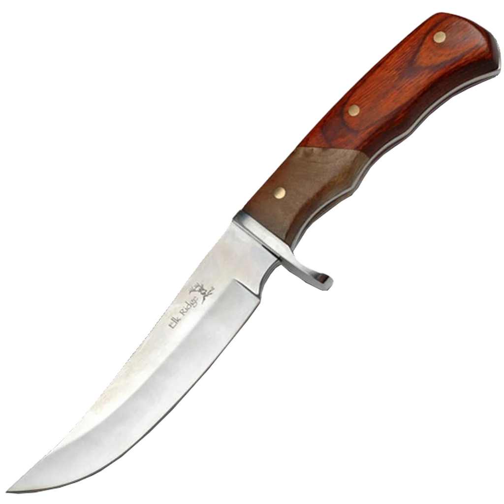 Elk Ridge ER-085 outdoor fixed blade knife measures 9.5" overall with a 4.25" blade. Great for hunting, fishing, and camping. The 5" blade is curved at the end for easier slicing as well as made with a stainless steel guard. The Pakkawood, burlwood handle has triple brass rivets to make this knife stand out from others. Includes a leather belt sheath.