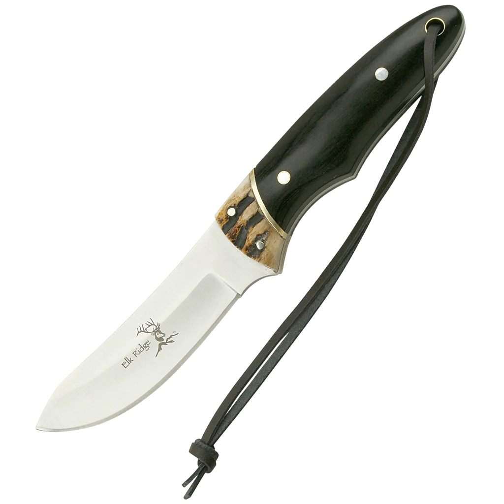 - Fixed blade made from 440 Stainless Steel with a Trailing Point profile, Pakkawood wood handles and "Elk Ridge" laser engraving. Also includes a Leather sheath for transpotation.