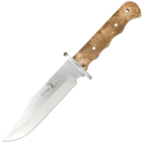 - Elk Ridge ER101 fixed blade utility knife. 10.5 in overall, 4.5 in stainless clip blade, full tang. Finger-grooved brown burlwood handles. Lanyard hole. Nickel silver guard. Black nylon belt sheath.