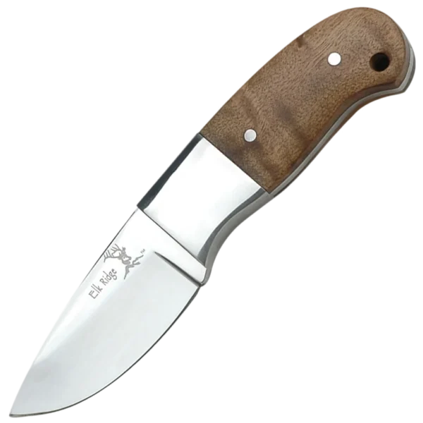 - Fixed blade made from 440 Stainless Steel with a Drop Point profile, Maple Burlwood handles and Elk Ridge logo laser engraving. Also includes a leather sheath for transpotation.