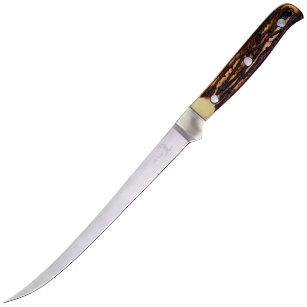 The Elk Ridge ER-146 Fixed Blade Knife is the ultimate outdoor fillet knife. The knife is 12.25" overall and features a 7.5" fine edge blade with a faux bone handle. Also included is a leather sheath. The Elk Ridge brand is manufactured by Master Cutlery to the highest standards. The line features exceptional, high value and beautifully designed items including Elk Ridge knives, Elk Ridge axes and Elk Ridge Machetes.