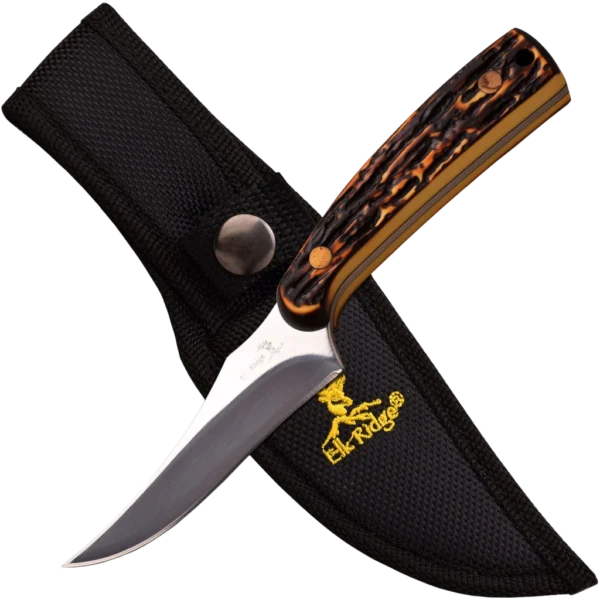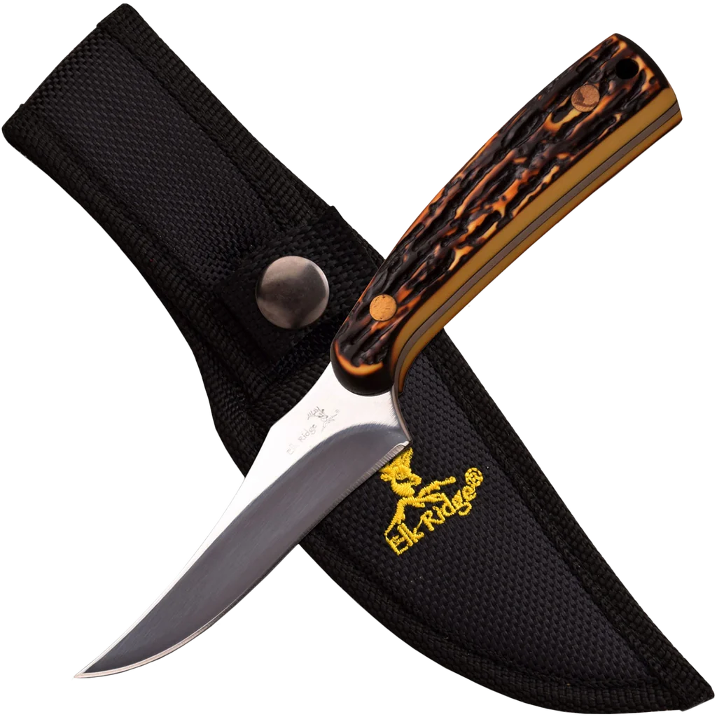 Functional fixed blade from Elk Ridge. Measures 7" overall with a 3.25" mirror finished plain edge blade. Comes with a continuously curved cutting edge for long slicing cuts. The handle is made from simulated bone and encapsulates the full tang of the knife for maximum durability. Also includes a black nylon sheath for safe storage.