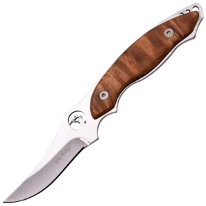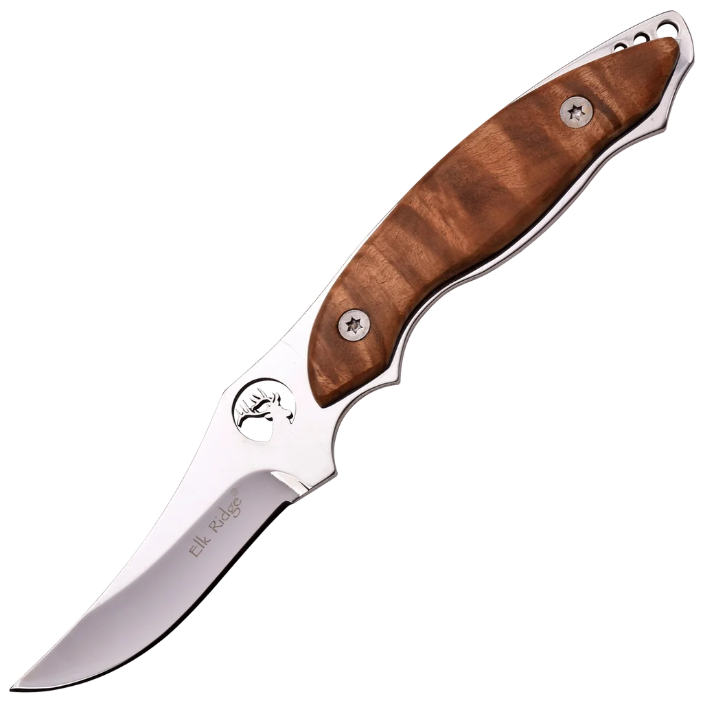 The Elk Ridge Fixed Blade Knife is great for the outdoors. It features a mirror finish 3Cr13 stainless steel tailing point blade with laser cut out Elk Ridge logo and a brown maple burlwood handle with lanyard hole. Nylon sheath included.