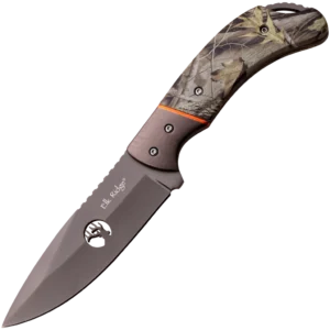 - Full tang fixed blade knife at 3.25", made from 440 stainlesss steel shaped to a drop point blade stlye with a TiNite coating. Pakkawood handles finshed in a camouflage print, includes a leather sheath for transportation.