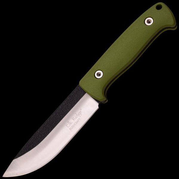 - Fixed blade knife, black. 10.5" overall. 5.3" black and satin finish 440 stainless steel drop point blade. Full tang. Green nylon fiber handles with lanyard hole, handle also has internal storage compartment. Black nylon sheath with fire starting kit and black cord lanyard.