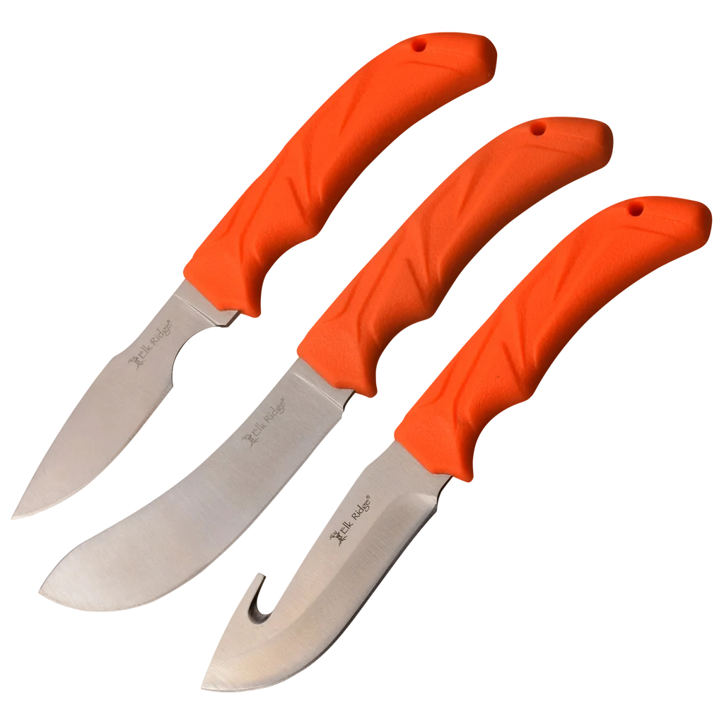 - Set of 3 fixed blades all made from 3Cr13 stainless steel with nylon fiber handles. This set of 3 includes a gut hook, spear point and triling point blade perfect to bring along on any camping trip.