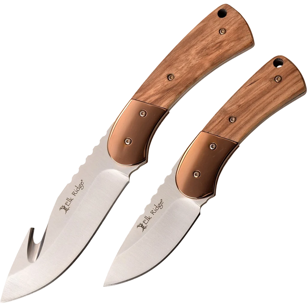 The custom designed ER-200-10BR Fixed Blade Knife Set from Elk Ridge comes in an eyecatching combination of colours that certainly reflects the quality of these knives. The 4.25"/3.6" zebrawood handles are complemented by a tinite coated bolster which contrasts the 3cr13 steel blade beautifully. Both knives have a drop point fine edge blade with a gut hook on the larger knife in the ER-200-10BR set. Both knives in the set have a zebrawood handle that has been secured with torx fasteners and includes a lanyard hole for added convenience. The set comes complete with a leather sheath that has been embossed with the Elk Ridge logo, a push-stud fastener and a large belt loop. Blade Length: 3.75" (9.5cm) Overall Length: 8" (20.3cm) Blade Material: 3cr13 Steel Blade Style: Gut Hook Drop Point Blade Length: 2.5" (6.3cm) Overall Length: 6.3" (16cm) Blade Material: 3cr13 Steel Blade Style: Drop Point