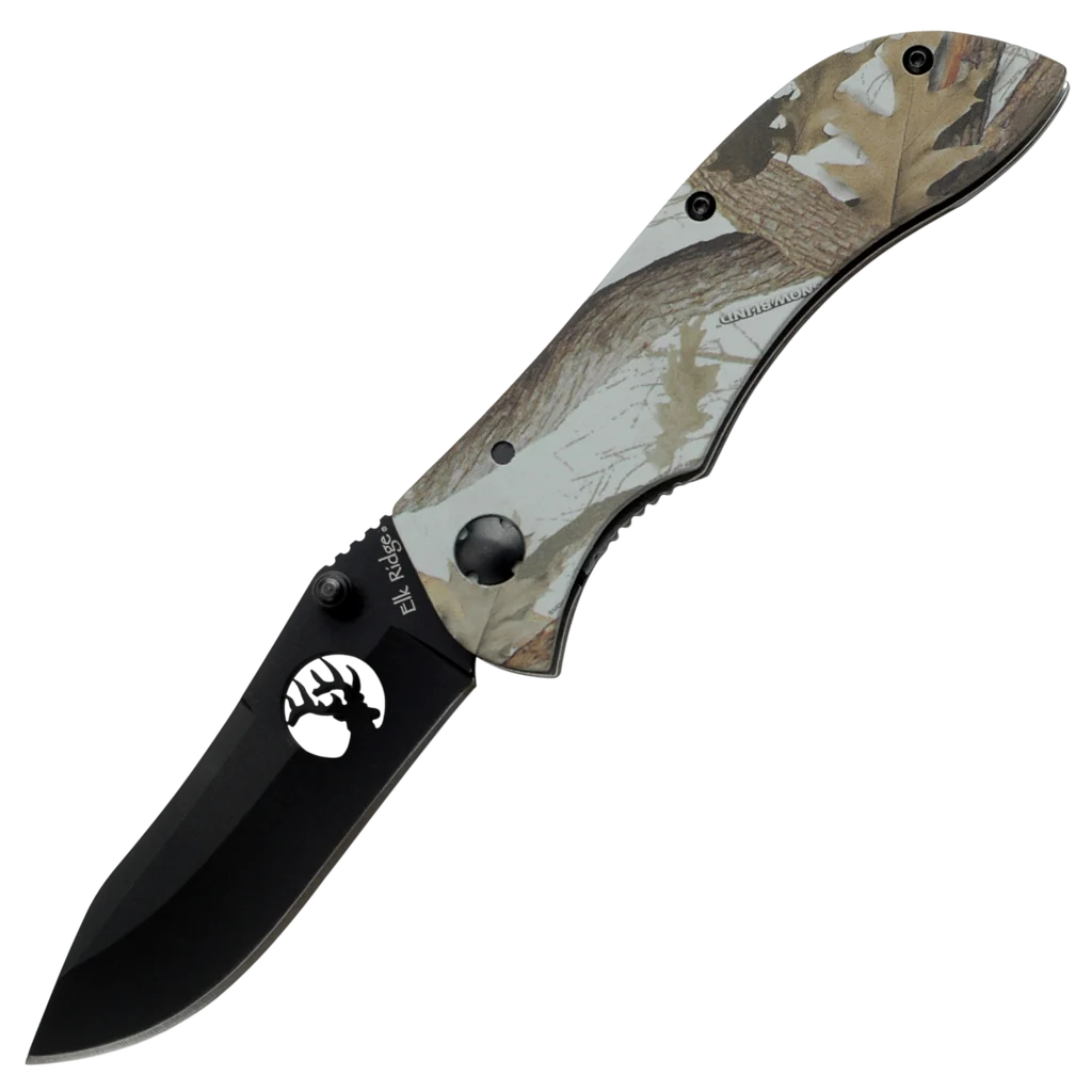 Crafted from black coated stainless steel, specifically chosen for it's non-reflective and anti corrosion properties this knife makes an ideal hunting companion. The blade is decorated with small swedge on the spine and laser cut Elk ridge logo adding to the overall aesthetic of the knife. Designed to fold into the camouflaged Aluminium handle containing a liner lock and pocket-clip this knife is a great compact cutting tool.