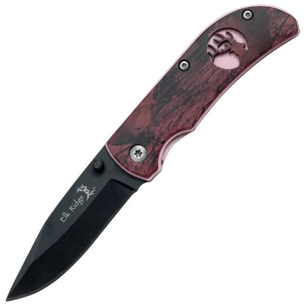 - 2.5" 440 Stainless Steel black-coated drop point blade with dual thumb studs. Camouflage aluminium handle with Elk laser cutout; handle features pink trimming and black stainless steel pocket clip.