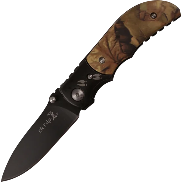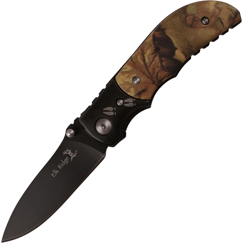 The Elk Ridge Manual Folding Knife by Master Cutlery features a 440 stainless steel drop point blade and an aluminium camo handle with a track pattern printed on the bolster. The handle has a tip-down pocket clip; the blade opens using ambidextrous thumb studs and is secured by a linerlock.