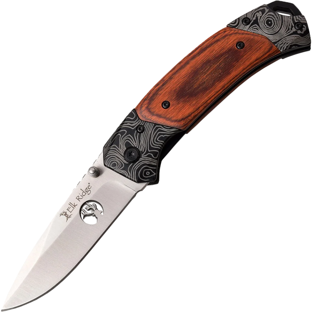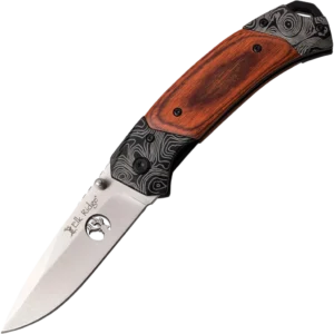 - 4.5" closed. 3.25" satin finish 3Cr13 stainless drop point blade with liner lock mechanism. Brown pakkawood handles, Extended tang, Thumb stud, Pocket clip, Lanyard hole and Scroll etched bolsters.