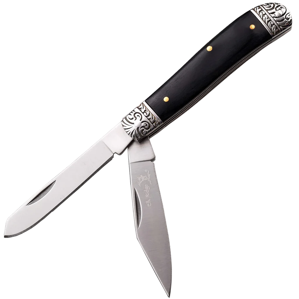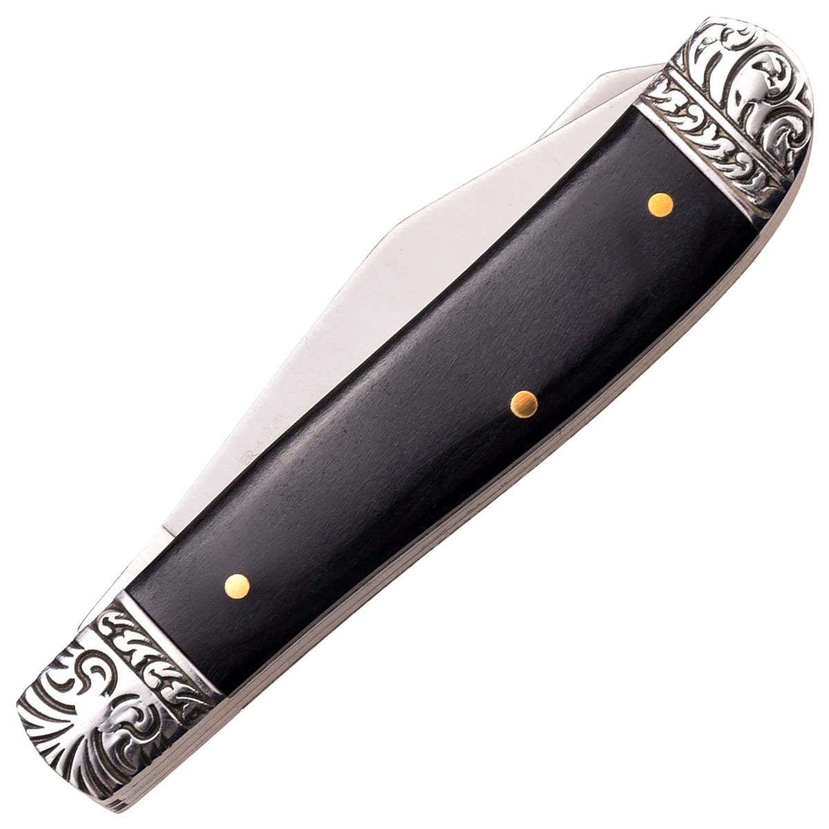 This simple dual bladed folding knife is a perfect Everyday Carry blade designed to be useful for a wide variety of cutting tasks. The blades measure 2.75", open with a nail nick and utilise a slip joint closure system. The handle is constructed from black wood with eye-catching engraved bolsters.