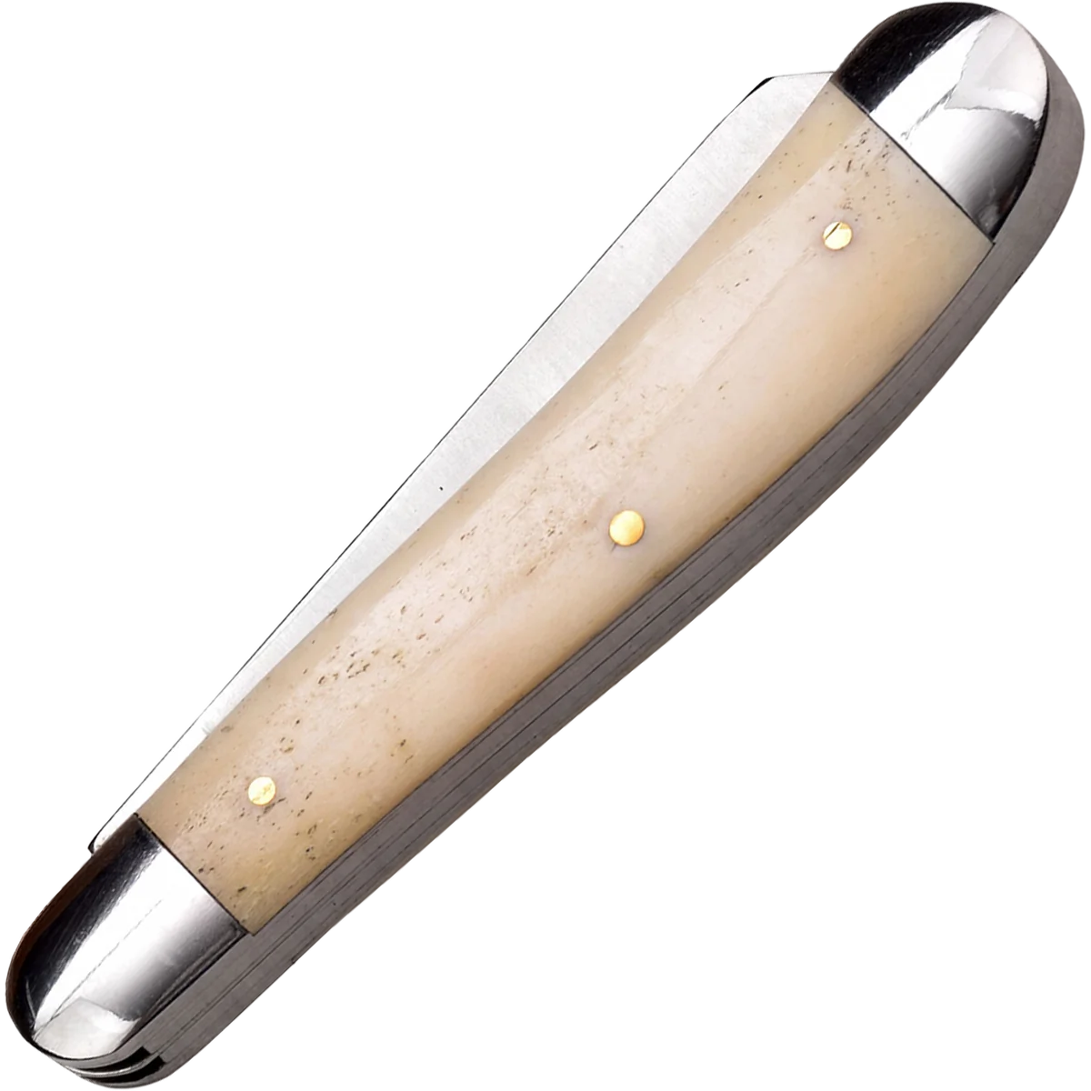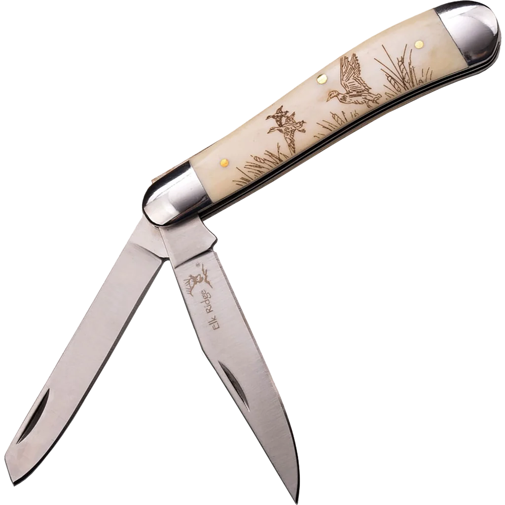 This simple dual bladed folding knife is a perfect Everyday Carry blade designed to be useful for a wide variety of cutting tasks. The spey and clip point blades measure 3", open with a nail nick and utilise a slip joint closure system. The handle is constructed from Ox Bone and features an attractive lazer etched duck scene.