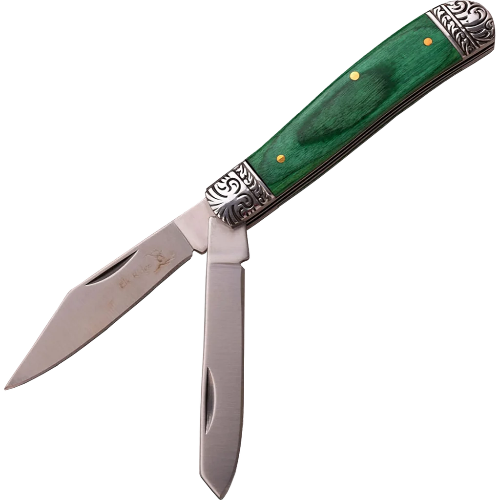 The two blades of this Elk Ridge Gentlemans folding knife fold back into an eye-catching bold green wood handle, complete with engraved bolsters. The spey and clip point blades measure 2.75", open with a nail nick and utilise a slip joint closure system.