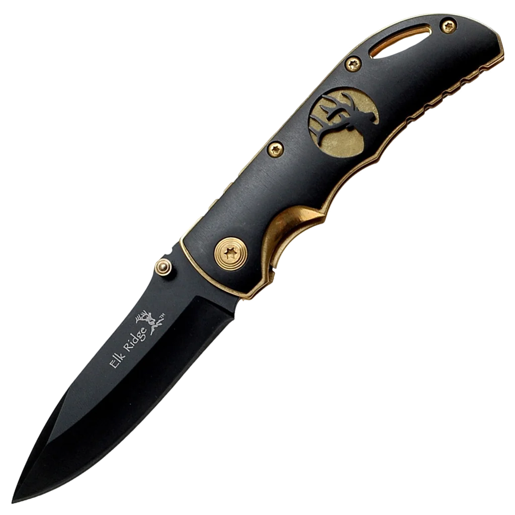 The Elk Ridge Gold and Black Linerlock feature a 2.75" black coated stainless steel blade and aluminum handles. The handle features gold coated stainless steel liners and tip-down pocket clip.