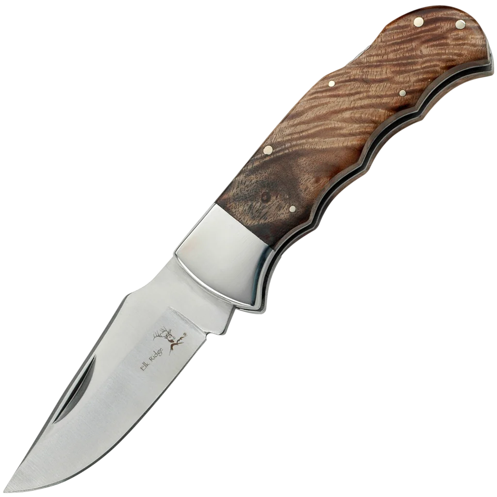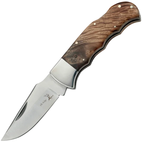 - Folding drop point blade made from 440 stainless steel with maple burlwood handles. Uses a lockback mechanism to ensure a reliably locked blade.