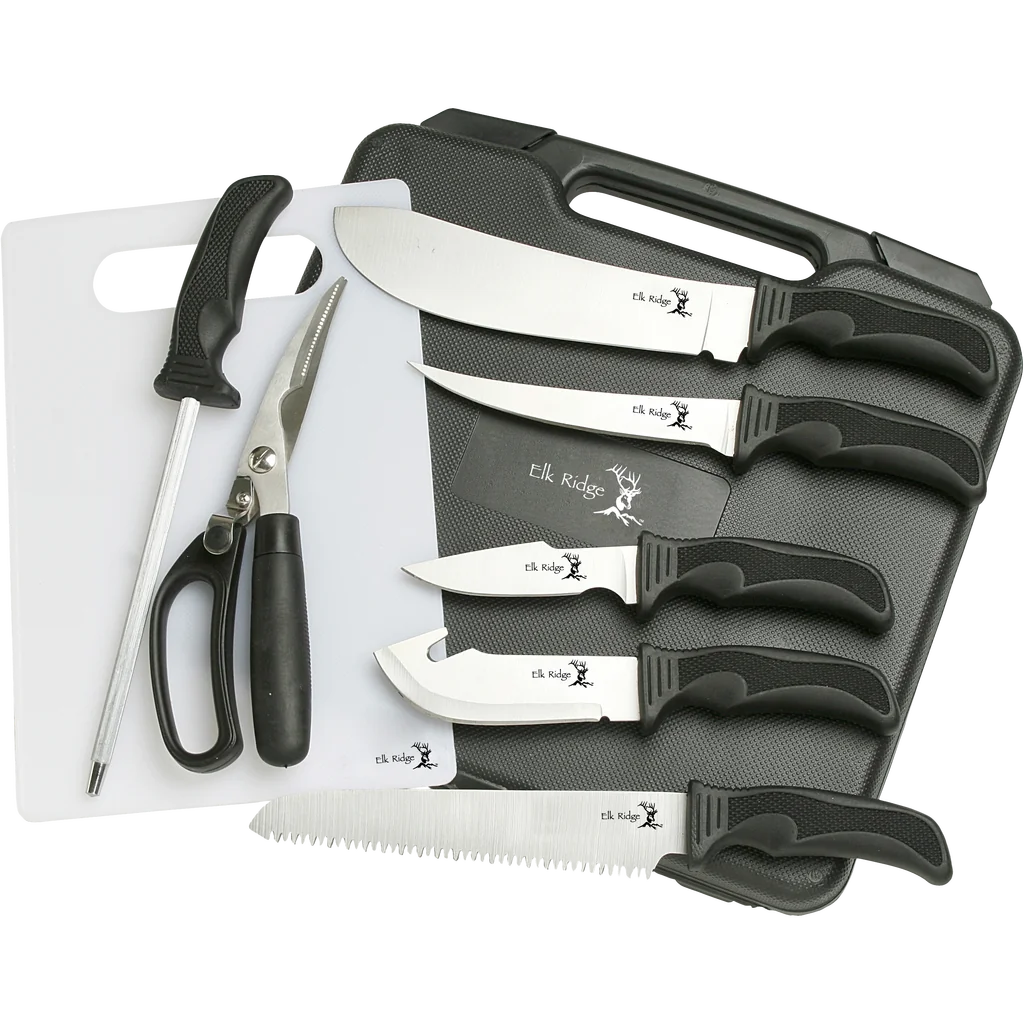 This 9-piece Elk Ridge Big Game Cutlery Knife Kit (model ER-190) is ideal for anyone who spends time hunting, camping, or fishing. All knives in this set are constructed using 440 stainless steel and have handles that were made from black nylon fiber, offering not only a durable, comfortable grip. This set includes: a butcher knife (12.5" overall), a saw (12" overall), fillet knife (10.25" overall), a gut-hook knife (9" overall), and a caper knife (8.15" overall). This set also comes with a sharpening rod, shears, and a cutting board. All items come packaged neatly in a black storage case, ensuring that everything stays organized and makes transporting this set to your campsite, RV, or boat a breeze. Designed for true outdoors adventurers.